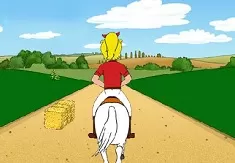 The two girls living at a farm, Bibi and Tina, are surrounded by animals, and they love them. Bibi's favorite animal is the horse, she has her own favorite horse, and she has learned how to ride him since she was a little girl. In the day that they don't have to work at the farm, or they take little break, Bibi and Tina like to race each other, so, they set up some obstacles and they test to see which one of them is better at horse riding. In this game, Bibi's Horse Ride, it's Bibi's turn, as you can figure it out, and you have to help her control the horse. By using your arrow keys you choose the horse's direction and you have to press space whenever you see an obstacle, in order to avoid it.