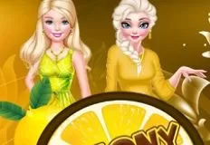 We really hope you dear kids are going to be curious enough to come and check out this brand new Lemony Girls at Prom in which we know you are going to have a good time and that is because this brand new Lemony Girls at Prom is a super fun girl game with Elsa the Frozen princess and with Barbie and the two of them are really good friends today and they simply want to have the best time ever. So come and check out this Lemony Girls at Prom in which you have to dress up Elsa the Frozen queen and of course dress up Barbie for their prom and the most important thing to remember is that they want lemony outfits, so you have to dress them up in a yellow colour. Good luck!