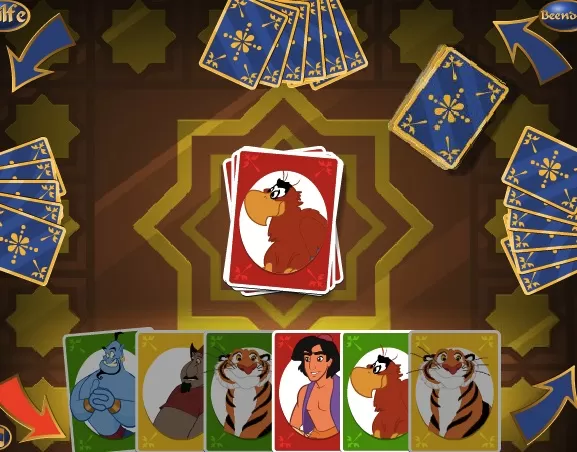 Welcome back here on games-kids.com where dear friends, today you can find a new online game from the Aladdin games category, in which dear friends, you can make good friends with Aladdin and the genie. In this game, you will have the chance to go with Aladdin and the blue genie into a cards game joint, a place in which dear friends Aladdin ang the genie comes to play cards, and now you are the special guest, and you will have to be very careful, because Aladdin and the genie told everyone that you are an excellent cards player, and so you will have to be very careful to win the games or play as best as you can. For someone to win the game, that person will have to have no more cards in his hand. These cards are with pictures of characters that appear in the Aladdin games or cartoons, and you will have to put down when it’s your turn the wright card or the wright colour of the same card to get rid of the cards from your hand, and when you will have no more cards in your hand, you will win the game and many points. Have fun!